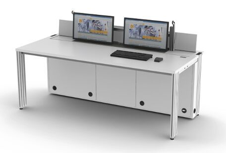 SybaPro aluminium lab bench with electrically retractable double monitor holder.